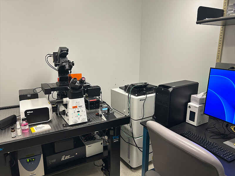 This Nikon AX R inverted confocal microscope system is configured with four excitation lines—405, 488, 561, and 640 nm—paired with 2K × 2K resonant scanning for high-speed, high-resolution imaging. A 600 µm high-speed piezo Z stage enables rapid volumetric acquisition, while a stagetop incubator maintains stable environmental conditions for live-cell imaging. The system also incorporates a tunable spectral detector unit for flexible emission detection and the JOBS software module for advanced, automated acquisition workflows.