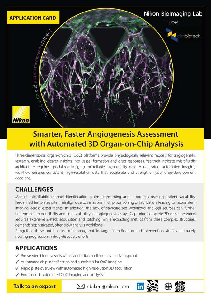 Three-dimensional organ-on-chip (OoC) platforms provide physiologically relevant models for angiogenesis research, enabling clearer insights into vessel formation and drug responses. Yet their intricate microfluidic architecture requires specialized imaging for reliable, high-quality data. A dedicated, automated imaging workflow ensures consistent, high-resolution data that accelerate and strengthen your drug-development decisions.