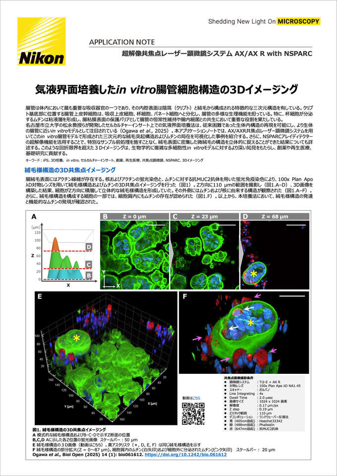 名古屋市立大学の松永教授らが開発したセルカルチャーインサート上での気液界面培養法は、従来困難であった生体内構造の再現を可能にし、より生体の腸管に近いin vitroモデルとして注目されている(Ogawa et al., 2025)。本アプリケーションノートでは、AX/AXR共焦点レーザー顕微鏡システムを用いてこのin vitro腸管モデルで形成された三次元的な絨毛突起構造およびムチンの局在を可視化した事例を紹介する。さらに、NSPARCアレイディテクターの超解像機能を活用することで、特別なサンプル前処理を施すことなく、絨毛表面に密集した微絨毛の構造を立体的に捉えることができた結果についても詳述する。このような回折限界を超えた3Dイメージングは、生物学的に複雑な多細胞性in vitroモデルに対するより深い知見をもたらし、創薬や再生医療、基礎研究に貢献する。