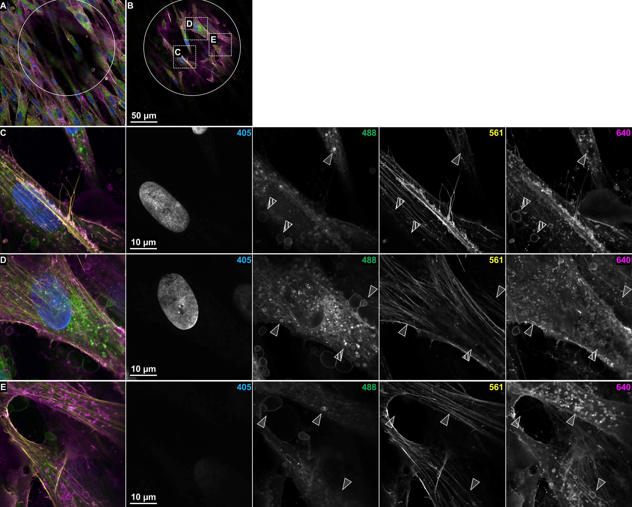 Figure 6: Diversity of cellular cargo revealed with NSPARC. (A) Full field of view image with 4096 x 4096 pixel resolution of surface level cells and underlying microchannel indicated by white circle. (B) Plane of interest 6 μm beneath the surface cell layer. Microchannel boundary indicated by white circle. Images acquired with the NSPARC detector and 40x Plan Apo λS silicone immersion in galvo-scanning mode. (C-E) Regions of interest indicated by white boxes in B with merged and single-channel views. Notable features include heterogenous vesicle staining patterns, different ratios of stained vesicles per cell, and subcellular localization of vesicles near the cytoskeleton or otherwise. White triangles indicate specific features of interest. Striped triangles indicate regions with more predominate staining in the 640 versus 488 nm channel.