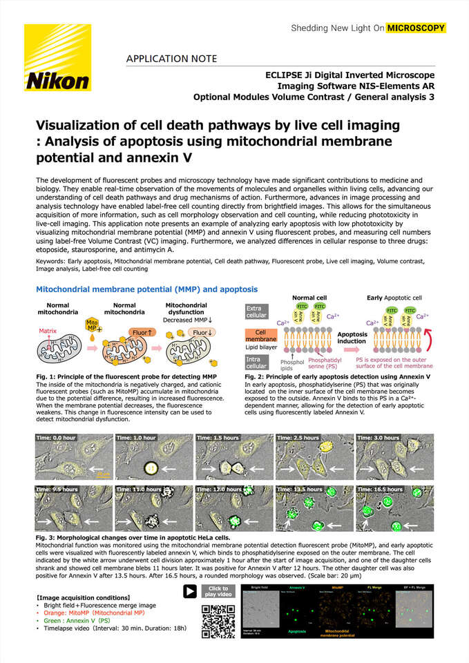 The development of fluorescent probes and microscopy technology have made significant contributions to medicine and biology. They enable real-time observation of the movements of molecules and organelles within living cells, advancing our understanding of cell death pathways and drug mechanisms of action. Furthermore, advances in image processing and analysis technology have enabled label-free cell counting directly from brightfield images. This allows for the simultaneous acquisition of more information, such as cell morphology observation and cell counting, while reducing phototoxicity in live-cell imaging. This application note presents an example of analyzing early apoptosis with low phototoxicity by visualizing mitochondrial membrane potential (MMP) and annexin V using fluorescent probes, and measuring cell numbers using label-free Volume Contrast (VC) imaging. Furthermore, we analyzed differences in cellular response to three drugs: etoposide, staurosporine, and antimycin A.